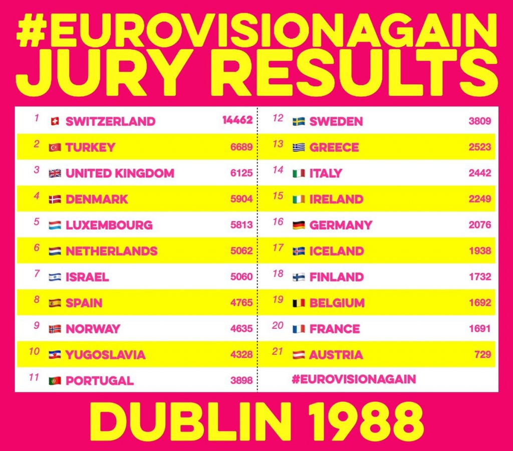 EurovisionAgain 1988’in birincisi, gerçeğinde olduğu gibi İsviçre oldu. Eurovision 1988’de Kanadalı şarkıcı Celine Dion İsviçre adına yarışmış, bir Atilla Şereftuğ bestesi olan Ne Partez Pas Sans Moi adlı şarkıyla 137 puan toplayarak birinci olmuştu.